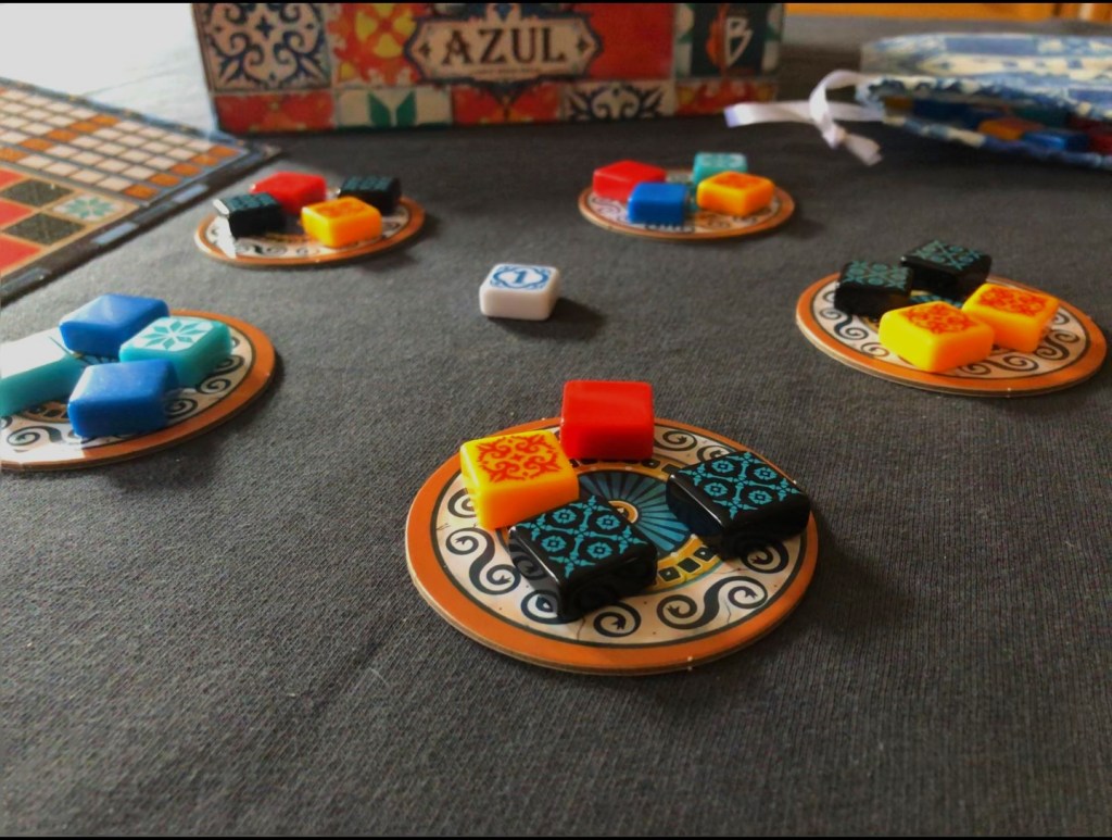 Cada jugador tendrá su tablero, su marcador para la puntuación y el último jugador que haya ido a Portugal es quien tendrá la pieza de jugador principal (si coincidís, podeis hacerlo de forma arbitraria) Una vez que cada jugador tenga todo esto, se meterá en la bolsa de tela Azul todos los azulejos que hay y por último colocamos de forma circular, dependiendo de cuantos jugadores haya, las losetas de factoría de forma circular: