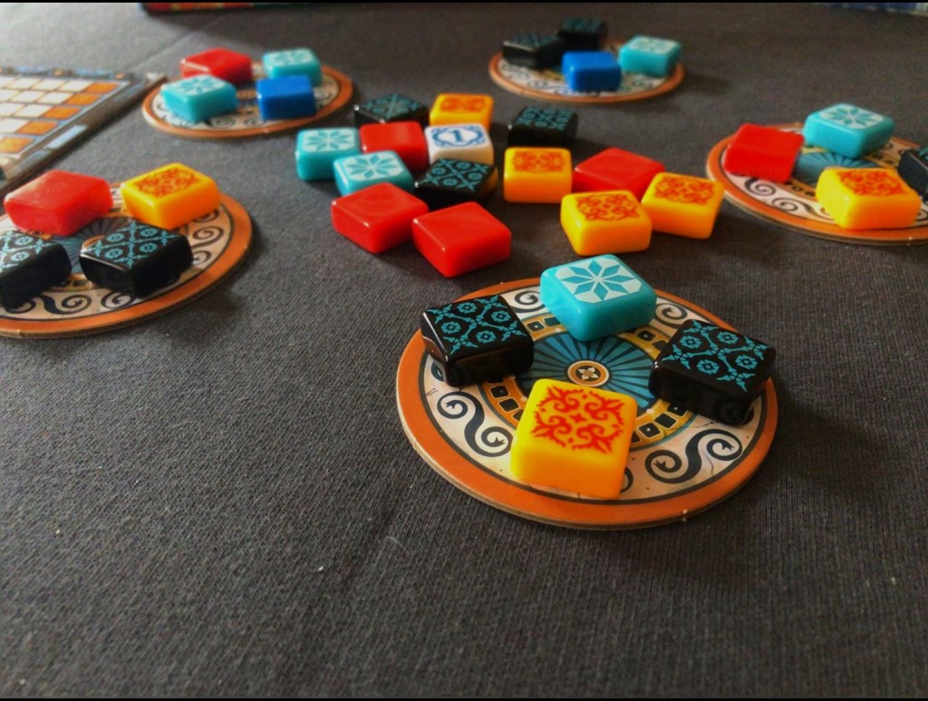 La preparación ya la tendríamos lista, ahora solo es empezar a jugar. El jugador inicial deberá elegir el azulejo con el que quiera empezar, de los que están encima de las losetas de factoría y para su complejidad se deberá coger todas las que hayan del mismo color. Se escogerá una loseta, encima tendrán las cuatro piezas de azulejo y de ahí cogeremos el azulejo que nos interesa, si hay dos del mismo color obligatoriamente los tendremos que coger, en el mismo caso de si hay tres o las cuatro, en el caso de que por ejemplo solo tengamos que coger un azulejo porque solo esté de un color, las otras tres se tendrán que descartar al hueco que deja el circulo en medio, una vez tengamos nuestras piezas de azulejo se llevarán al tablero y el jugador inicial tendrá que descartar su pieza inicial al medio junto con las piezas que se acaban de descartar.