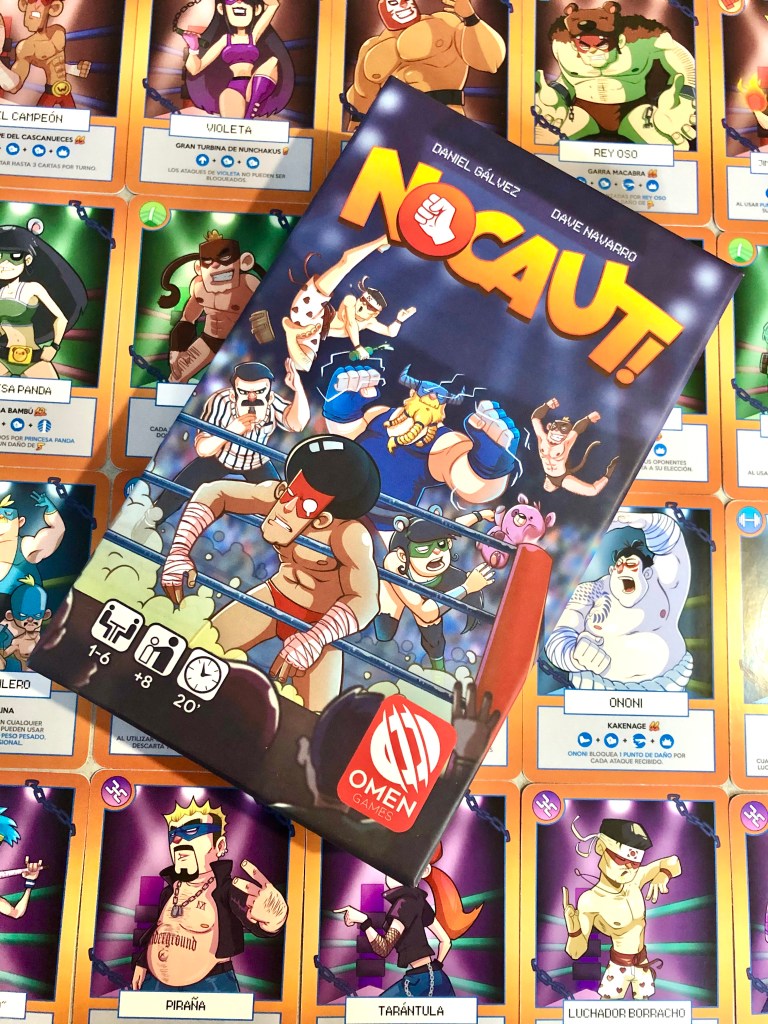 Nocaut! Es un divertido juego de cartas de Omen Games, creado por Daniel Gálvez y Dave Navarro, de 2 a 6 jugadores, con partidas de duración estimada de 20 a 30 minutos y recomendado para mayores de 8 años. En él nos meteremos en la piel de luchadores en busca de la fama y gloria sobre el ring. Un juego en el que tenemos que ser el último en quedar K.O.