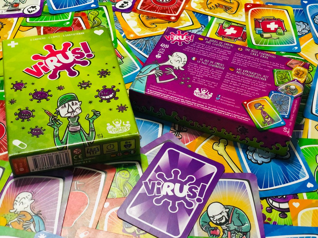 Así se presenta este Virus! Un juego creado por Domingo Cabrera, Carlos López y Santi Santisteban ilustrado por David GJ y de la editorial Tranjis Games. Un filler rápido y ágil, de 2 a 6 jugadores con partidas de aproximadamente 20 minutos de duración (según la caja aunque la realidad puede distar bastante según el número de jugadores) y recomendado para mayores de 8 años.