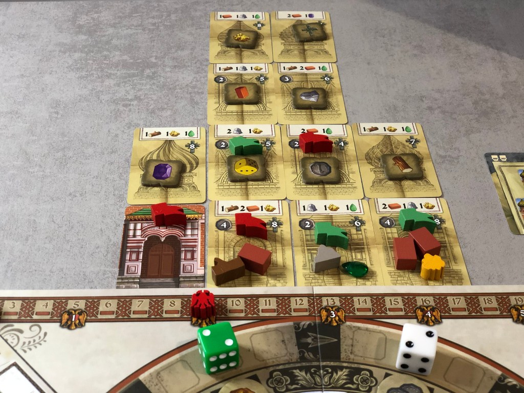 Coloca una bandera en dicha sección y toma la ficha de taller que hay sobre la misma para llevarla a su Taller. Solo pueden reclamarse las secciones más inferiores que haya disponibles de una de las «torres» de la Catedral. La ficha del Taller adquirida debemos colocarla en uno de los huecos disponibles de nuestro taller, junto a los iconos de dados. Si se quiere obtener ese efecto, habrá que pagar tantos rublos como hueco en el que queramos colocarlo. Si no se quiere obtener el efecto, no se paga cantidad alguna y se coloca la ficha boca abajo junto al dado que queramos. Activarla nos da el efecto inmediatamente y, además, nos permite que al usar el dado al que esté unido, nos de también ese mismo efecto.
