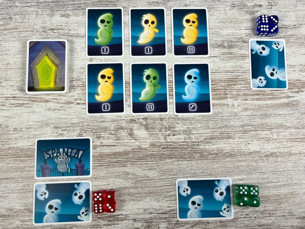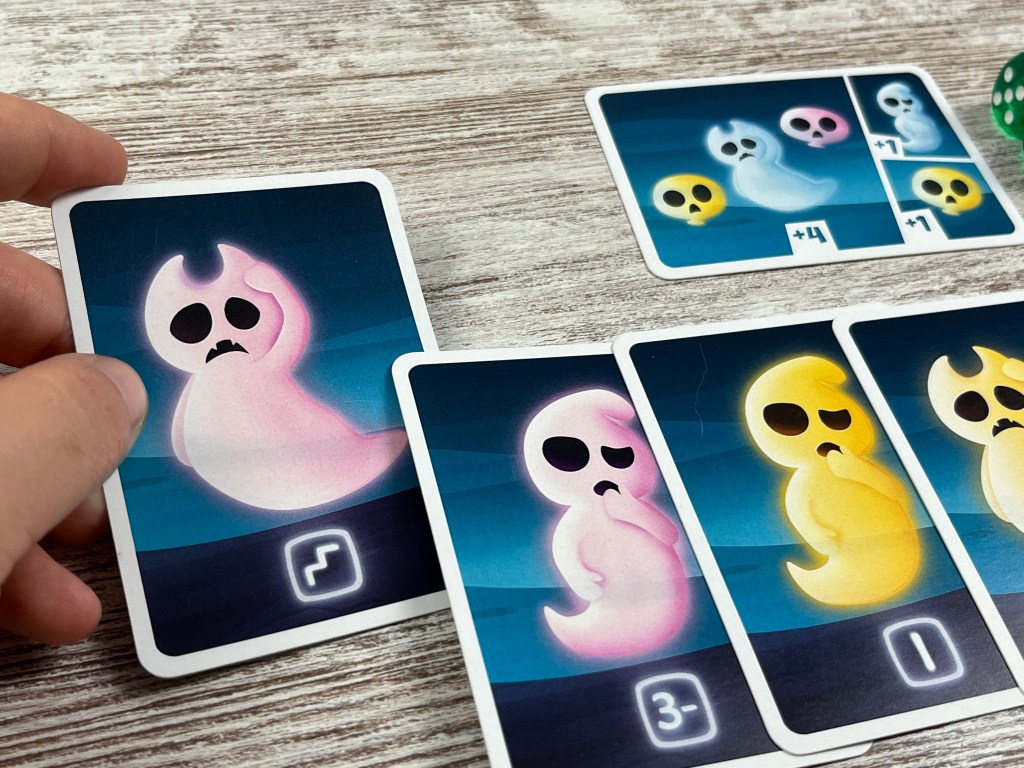 Veréis, el juego tiene una mecánica que gusta a todo el mundo: push your luck. Tentar la suerte siempre es divertido y fácil. Solo es lanzar unos dados y esperar que tengamos la suerte de conseguir la combinación esperada. Pero, en este caso, esa combinación que para nosotros puede ser la esperada, también puede serlo para otro jugador que, por orden, juegue antes que nosotros. De ahí que sea necesario tener una visión estratégica, algo que, los más peques, aún no tienen. No sirve de nada obcecarse en conseguir el comodín si el jugador que juega antes que nosotros crees que también puede quererlo. Pero no es solo esta interacción lo que, a nuestro ver, hace que el juego efectivamente deba ser jugado a partir de los 10 años, también está el hecho de colocar las cartas. Mi sobri, se obcecaba con capturar fantasmas de su carta de objetivo y luego no tenía para descartar «las que no valían». O a la hora de colocarlas, tenías que explicarle porque una la debías colocar delante y otra detrás, porque el bajaba todo sin orden. Quizás no sea así como jueguen todos los niños y niñas de esa edad, pero mi sobri es de los cabezotas… xD