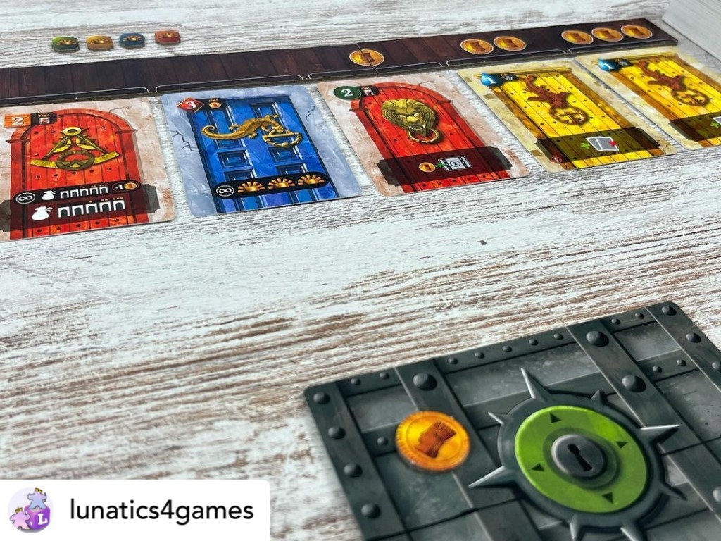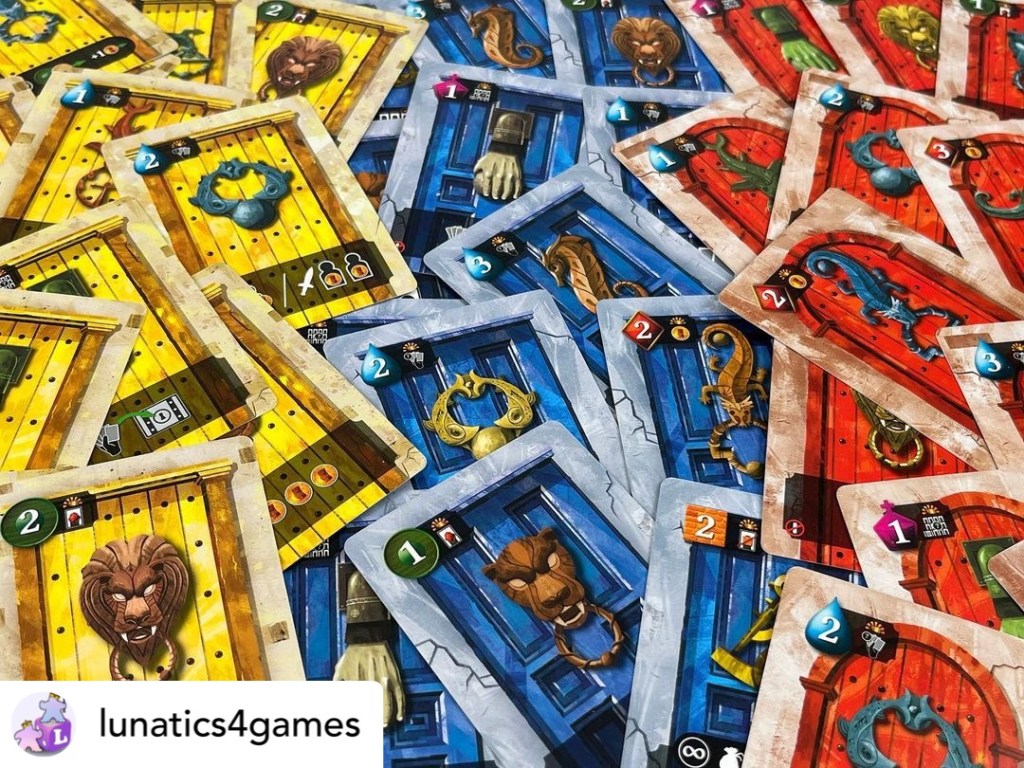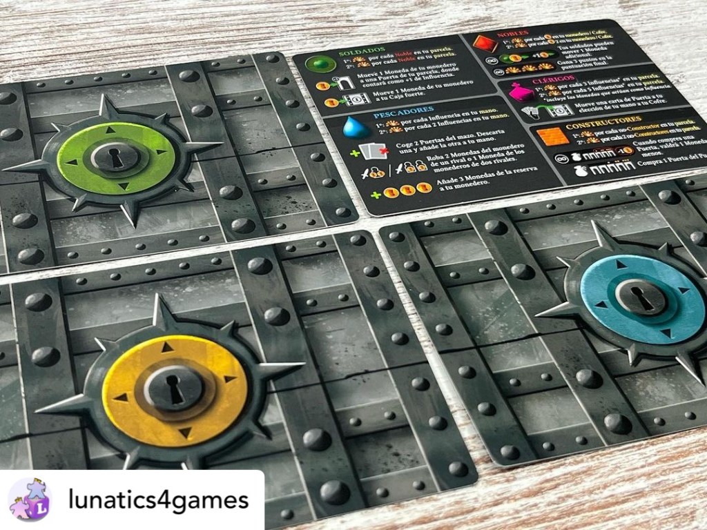 2.- Cada jugador recibe una carta de Cofre, cinco cartas aleatorias de Puertas y un marcador de puntuación del mismo color que su Cofre.