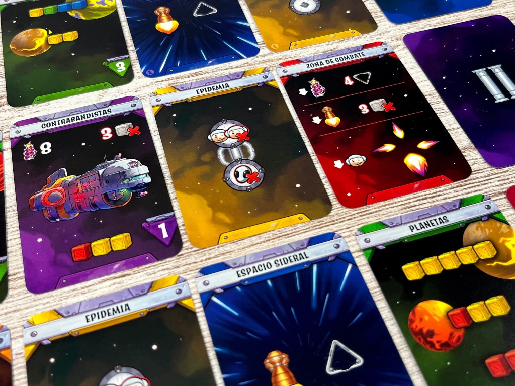 – Las CARTAS son el motor de la segunda fase del juego. Se trata de cartas de Aventura que nos pueden otorgar beneficios (como créditos o mercancías) pero que también pueden suponernos «la tragedia». Existen varios tipos de cartas: Planetas (que nos permiten obtener mercancía), lluvia de meteoritos (que tendremos que «esquivar» para no perder partes de nuestra nave en el proceso), espacio sideral (determinando el valor de velocidad de nuestra nave para avanzar en el track de puntuación), enemigos (comparando nuestra potencia de fuego con el enemigo determinamos quien gana), estaciones/naves abandonadas (perderemos tripulación para quedárnosla y obtener créditos), etc…