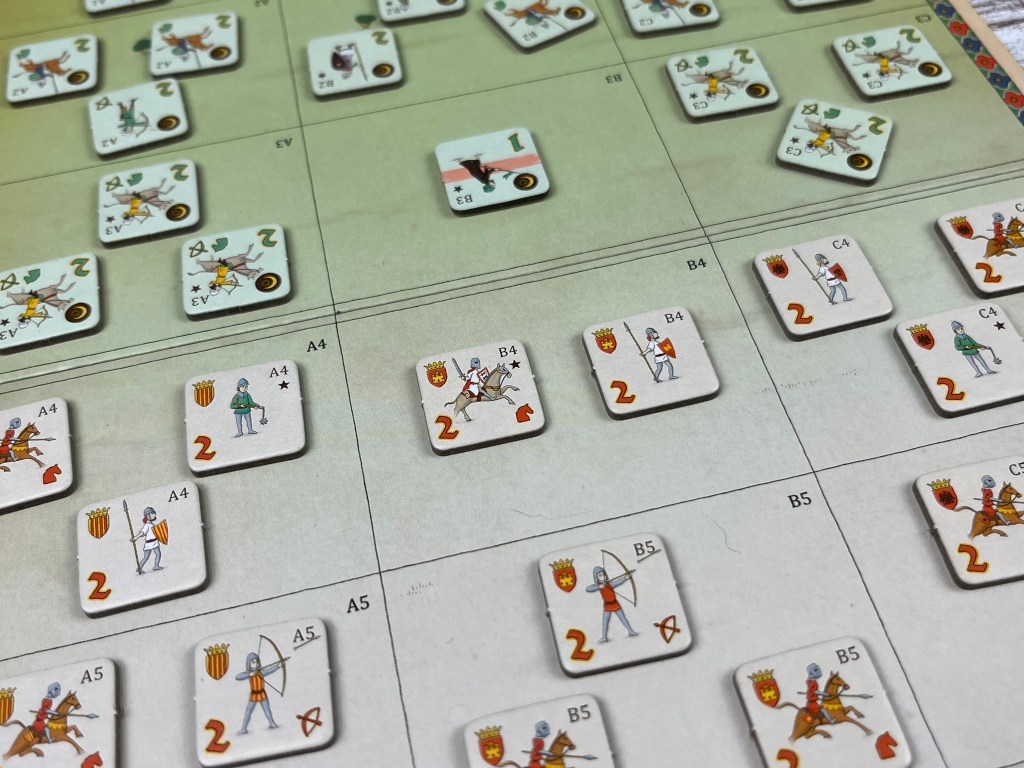 Las Unidades son fichas cuadradas a doble cara en las que podemos ver el tipo de unidad (normal, arquero o caballo) y su valor de poder/vida (2 o 1 en la segunda cara).