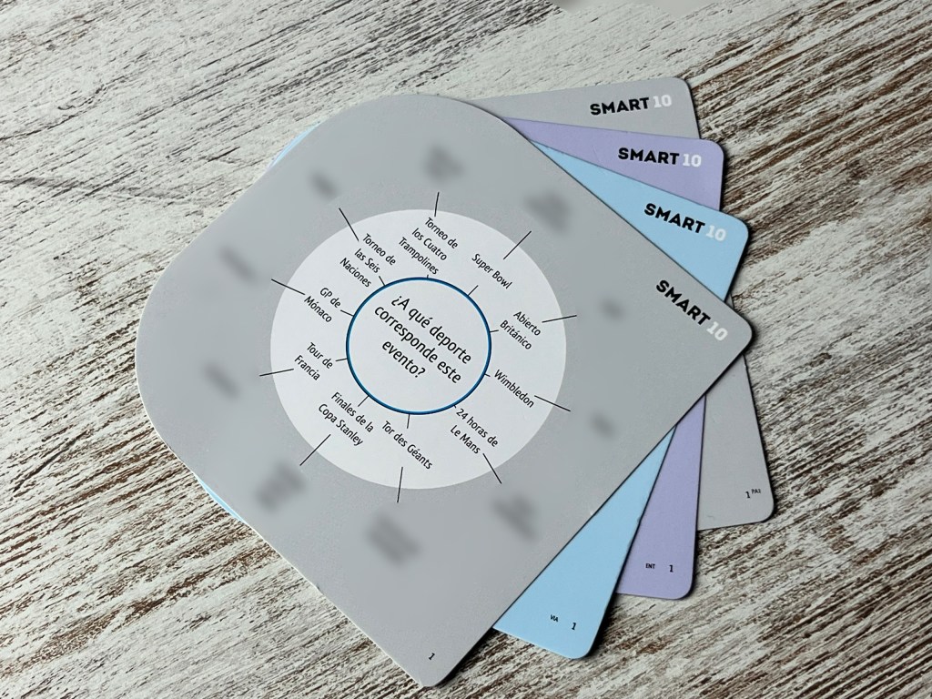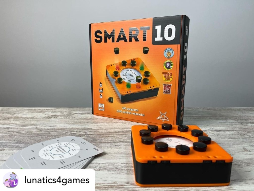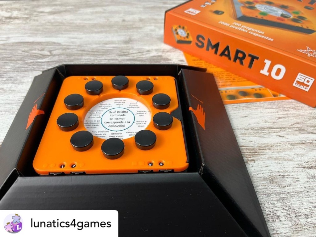 Dejamos a un lado los viejos Trivial y nos unimos al vicio que otorga este juego de tamaño reducido que nos da tantas horas de diversión. Smart 10 es un juego de preguntas y respuestas. Algo muy clásico que ha tomado un formato novedoso. Cada pregunta tiene 10 respuestas. Los jugadores o equipos se alternarán para responder a esas preguntas e irán levantando los marcadores para saber si aciertan o no. ¡Tensión absoluta!