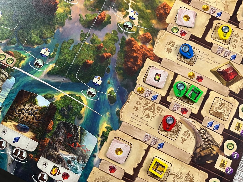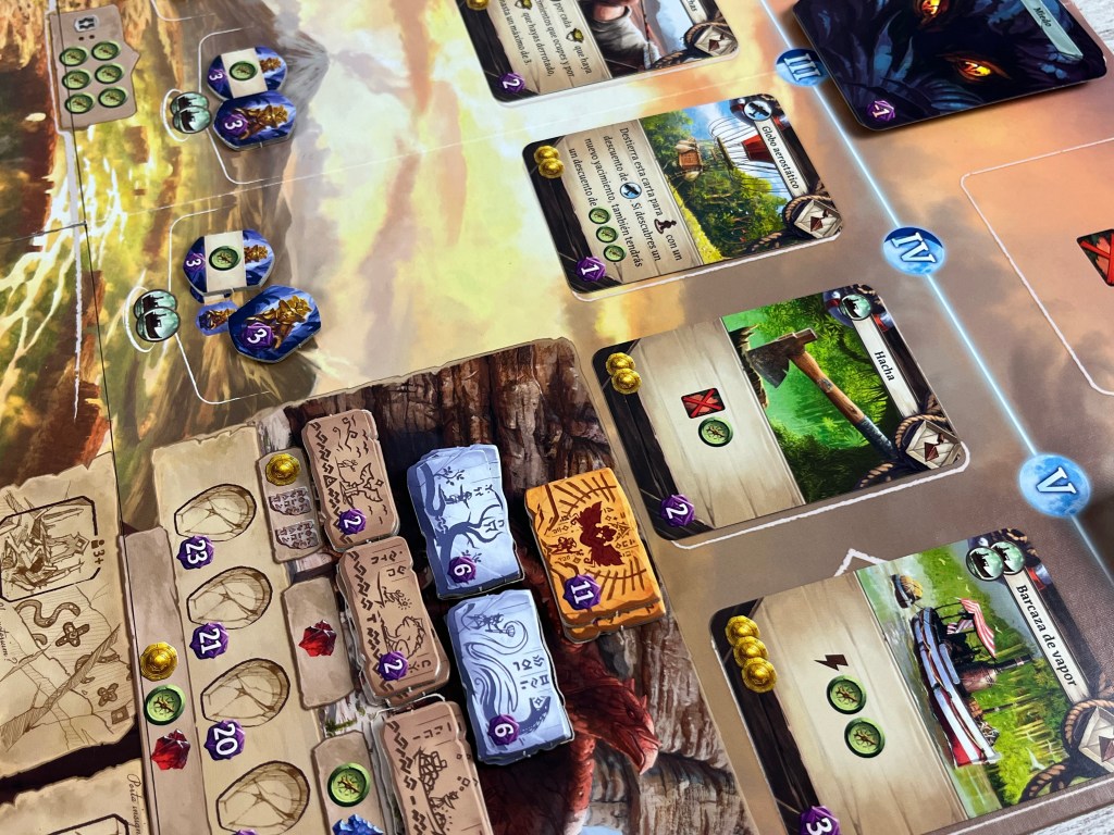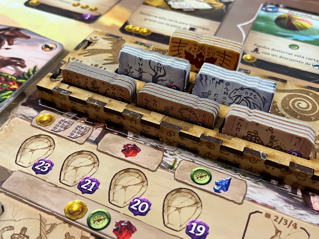 Otra cosa que nos gusta mucho es la tensión y lo bien implementada que están la temática y la mecánica. Ser arqueólogos no es algo sencillo. Ir a la deriva sin saber qué vas a encontrar es duro y complicado. Investigar y anotar es algo que todo buen arqueólogo tiene que hacer. Realmente, se siente bien implementado y se disfruta por ello. Además, los componentes de plástico y madera, son geniales. Si bien, los componentes de cartón son bastante mejorables, incluida la caja que parece que se va a desmoronar más temprano que tarde.