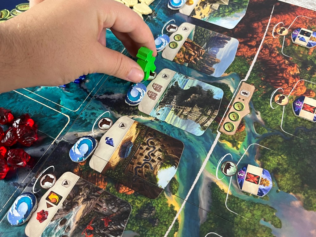 2. Descubrir un Nuevo Yacimiento. Desplázate a un yacimiento de nivel 1 o 2 sin descubrir pagando, no solo el requisito de desplazamiento sino también un valor en brújulas (3 o 6). Toma el ídolo, activa su efecto si puedes y llévalo a tu tablero (si es de nivel 2 te llevas ambos ídolos pero solo activas la acción del que estaba boca-arriba). Coloca una loseta de yacimiento del tipo que corresponda, boca-arriba en ese lugar. Adquiere los recursos de ella. Después libera al guardián.
