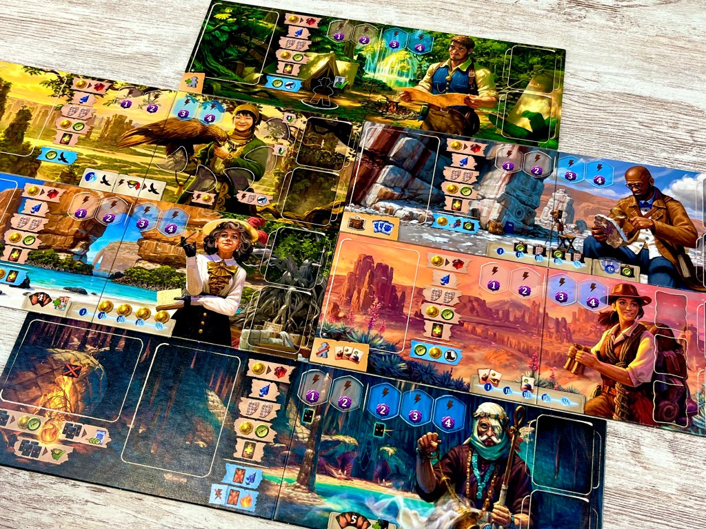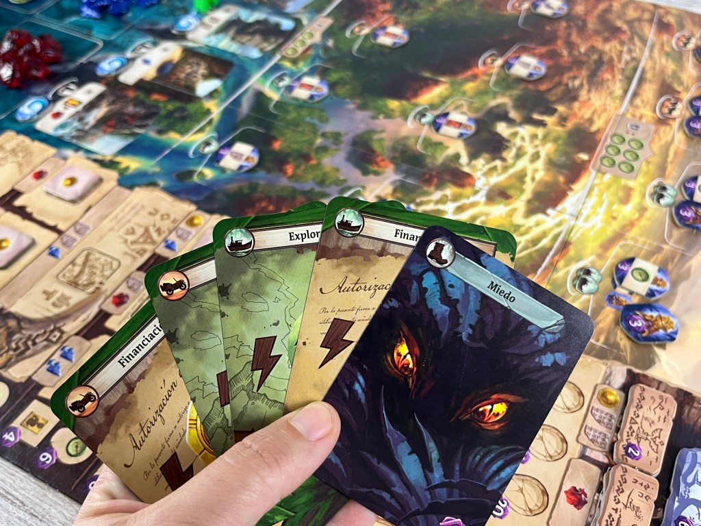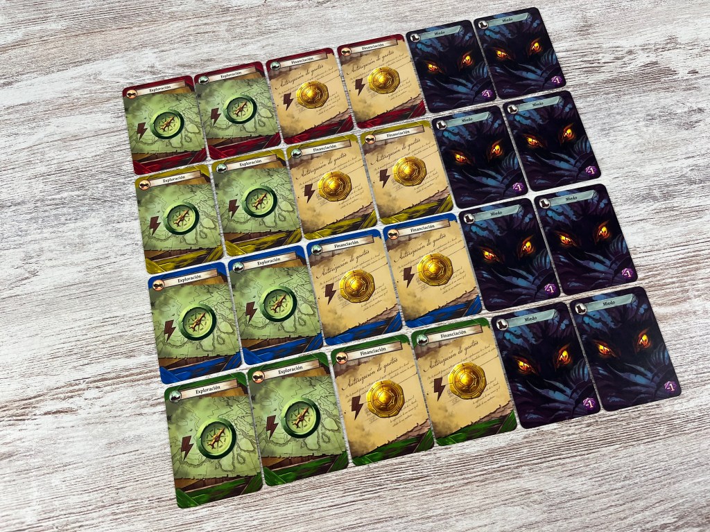 – Finalmente, cada jugador se prepara. Escoge un color y toma su tablero, arqueólogos, cartas iniciales y dos cartas de miedo, lupa y cuaderno. Coloca su lupa y cuaderno en la parte inferior del track de investigación; baraja sus seis cartas, roba cinco y coloca la restante sobre el tablero de jugador. Y recibe monedas y/o brújulas según su turno. ¡Y todo listo!